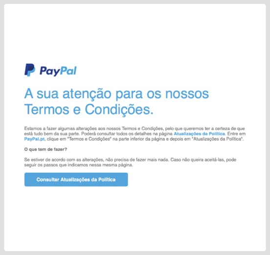 Também enviamos e-mails com atualizações que podem ser do seu interesse e corresponder às necessidades da sua empresa. Receberá notícias sobre os nossos produtos e serviços, assim como ofertas PayPal e dos nossos parceiros. Poderá também receber inquéritos para ajudar-nos a melhorar a sua experiência com o PayPal. Pode gerir as atualizações que pretende receber.Exemplos de atualizações: