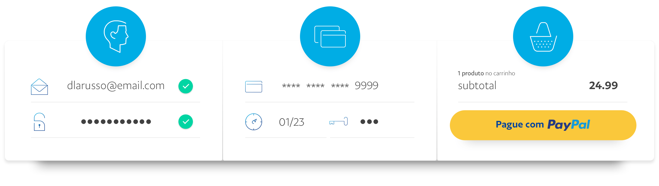 Com PayPal você só precisa de login e senha para pagar e não compartilha o número do seu cartão de crédito com os vendedores. Assim suas informações financeiras ficam mais protegidas.